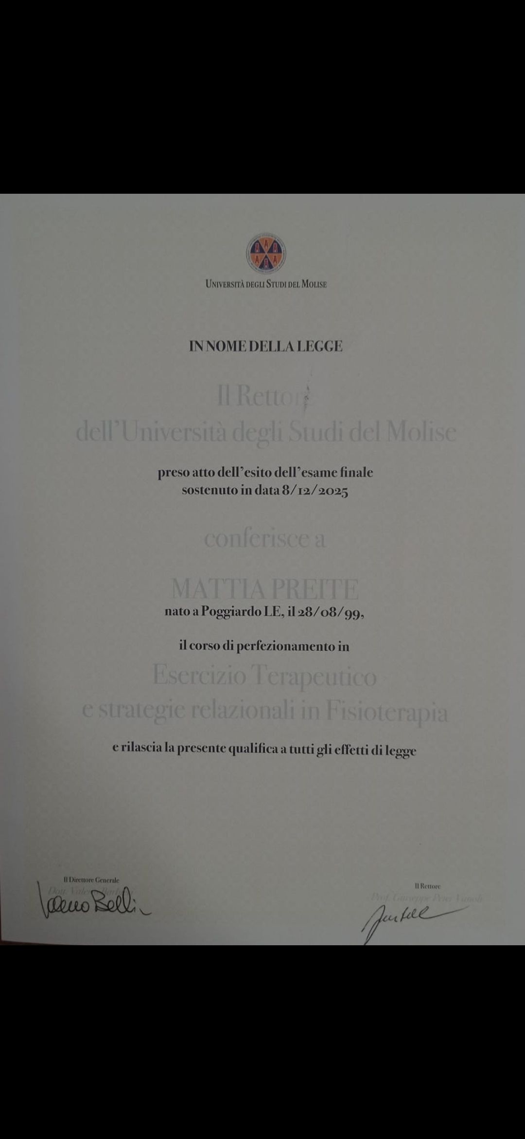 Mi sono laureato nel 2023 presso l' Università degli studi di Bari con votazione 110/110L riuscendo ad ottenere il Plauso dalla commissione. Negli anni successivi ho continuato ad investire sulla mia formazione ottenendo l'attestato di partecipazione al corso "Shoulder Practice Course". Successivamente ho effettuato l'iscrizione al "Corso di Perfezionamento in Esercizio Terapeutico e Strategie Relazionali in Fisioterapia" presso Università degli studi del Molise.